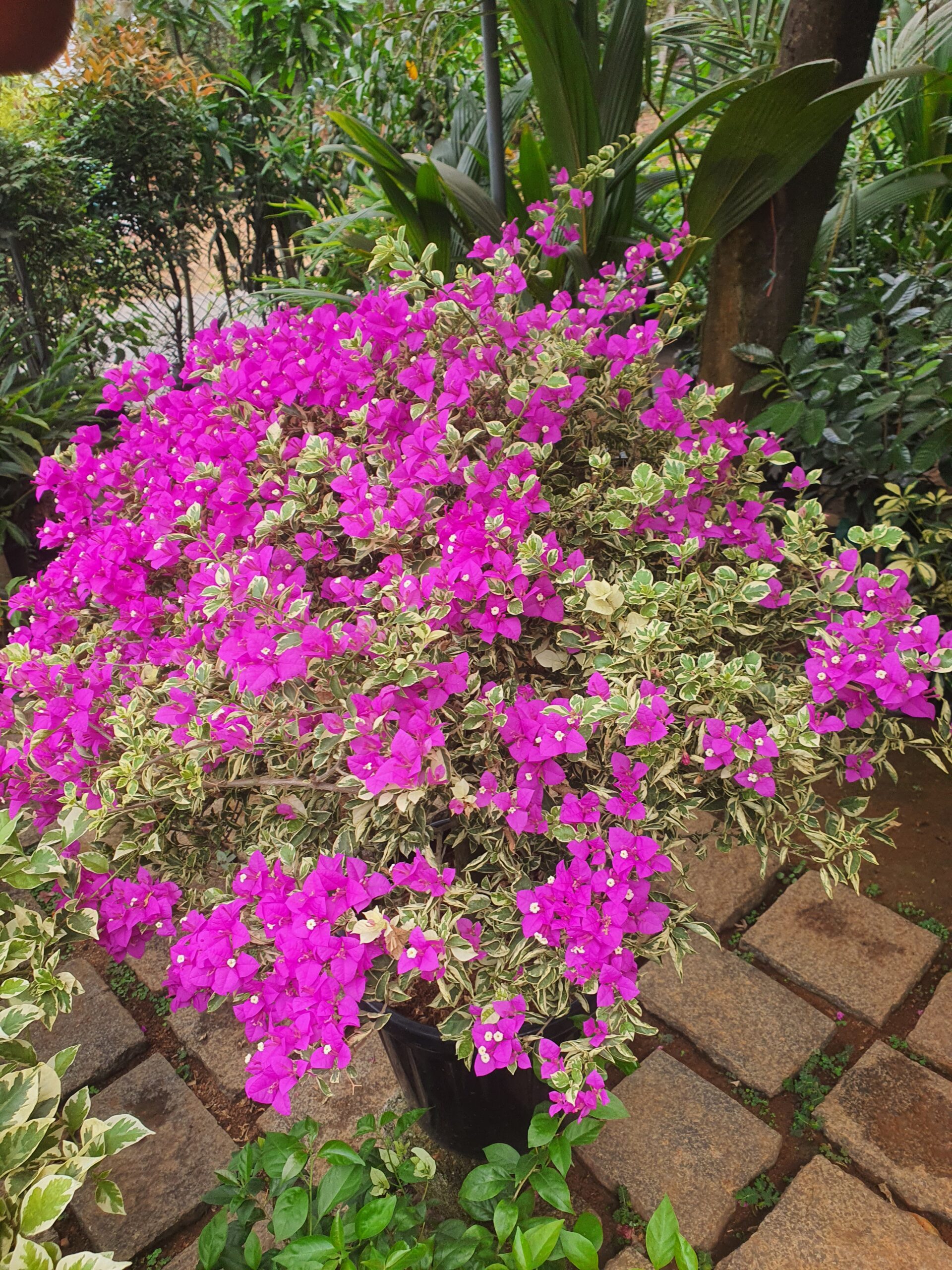 - The most eye-catching feature of this bougainvillea is its beautiful, rich purple to magenta bracts, which create a striking contrast against its variegated leaves.